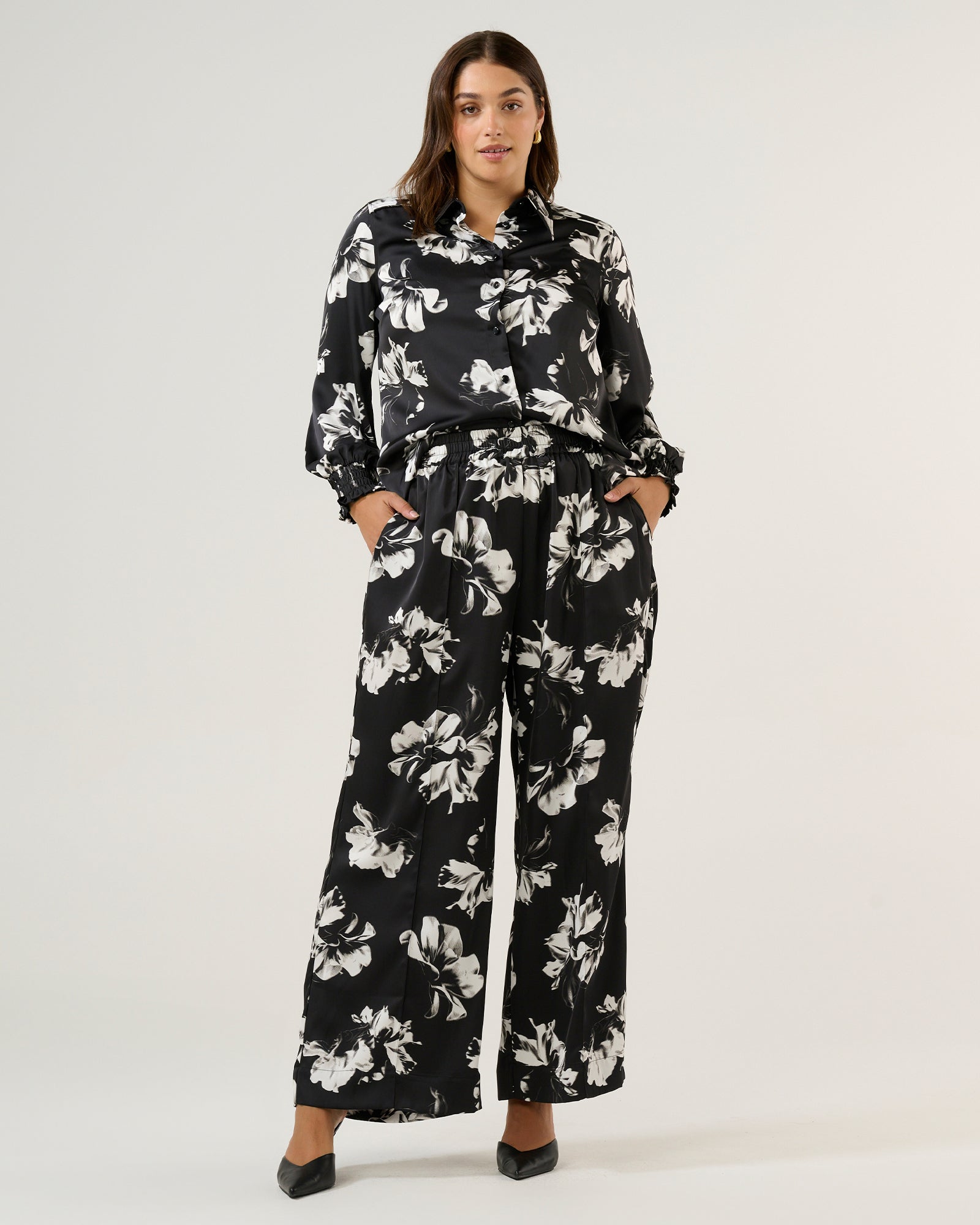 A striking piece that combines elegance and ease in a bold black and white print, the Gilda Pant features a full-length, wide-leg silhouette. These pants offer a flowy, relaxed fit that flatters every figure. The pintuck detail along the front leg adds a sophisticated touch, while the wide hem and side pockets enhance the overall design. Pair with the matching Gilda Shirt and sleek heels for a polished office look.