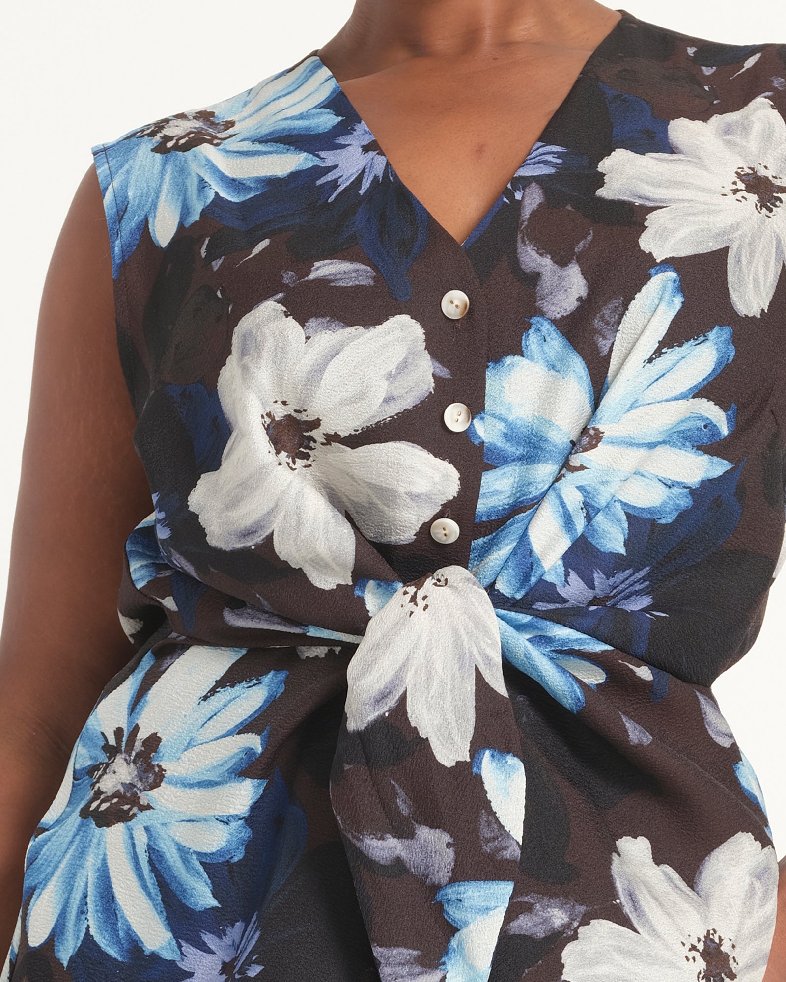 Feminine and refined, the Aveline Top by Estelle in our Choc Sky print introduces a modern touch to classic styling. This sleeveless design features a fitted silhouette and a flattering V-neckline that transitions into a button-down front. A tie up detail at the centre front adds a hint of shape and charm, creating a look thats both versatile and chic. Style it with a sleek skirt for polished daywear, or with tailored pants for an evening esemble.