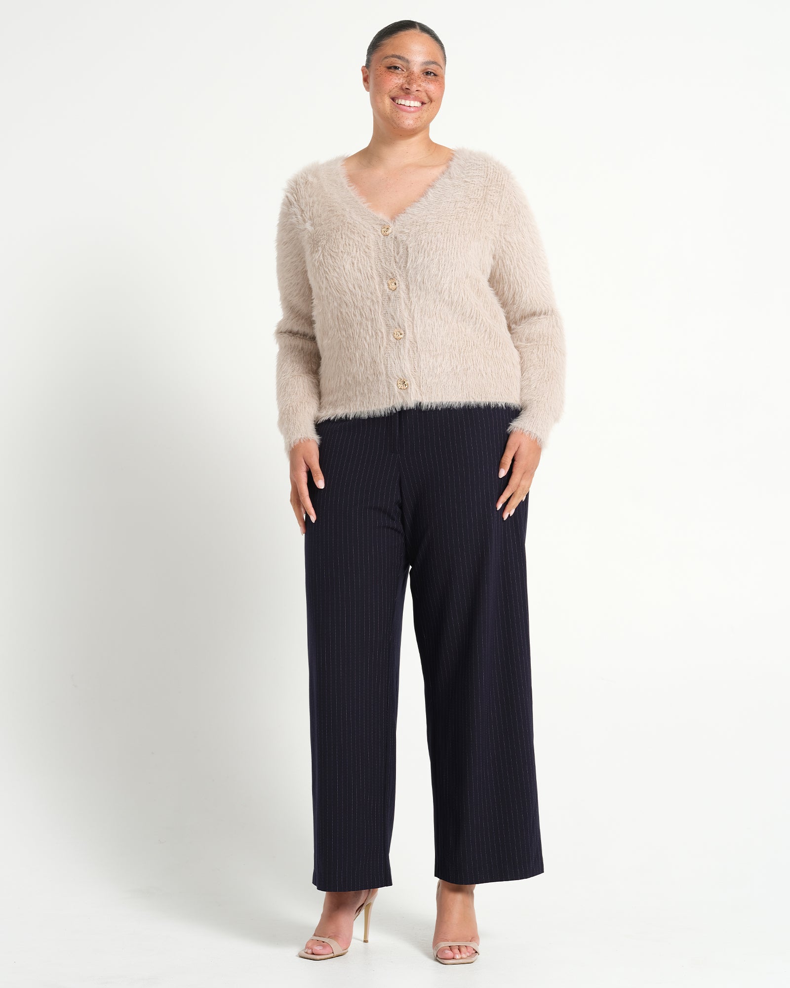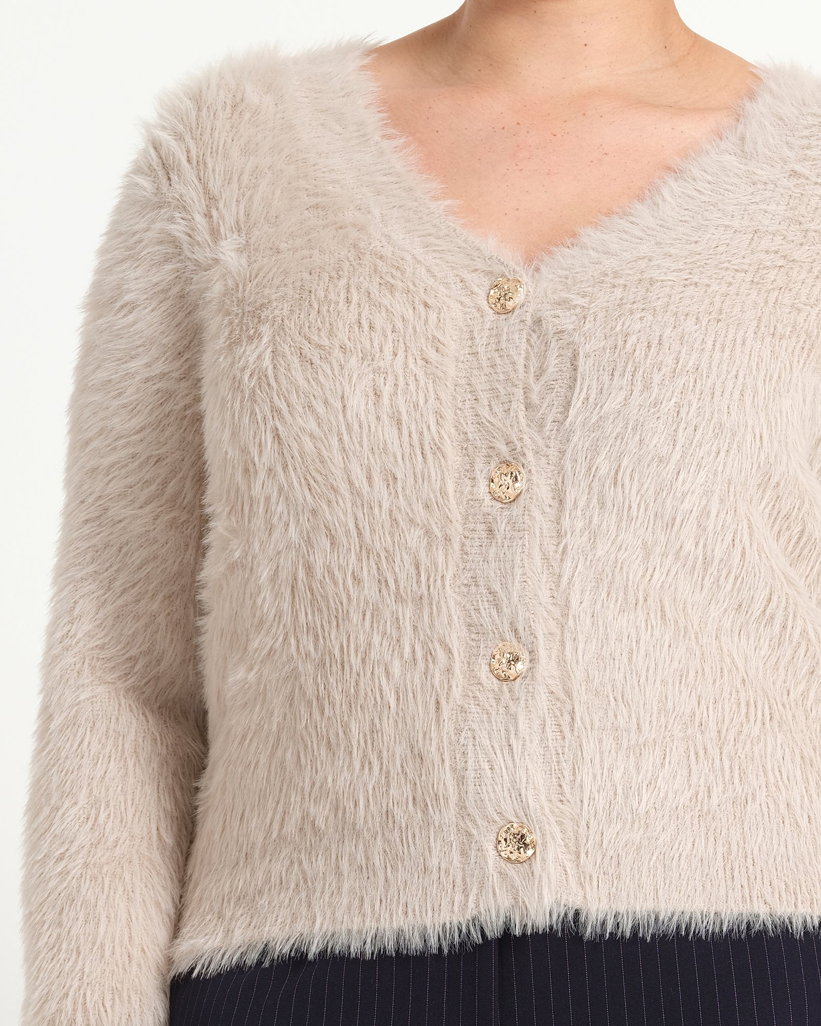 Introducing the Chantelle Cardi in Taupe, a refined staple designed for everyday sophistication. Made from a nylon blend, this fitted style features a V-neckline and long sleeves, with ribbed detailing. The front is accented with textured metal buttons, adding a modern edge to this timeless silhouette. Whether layered over a slip skirt or paired with tailored pants, the Chantelle offers endless styling versatility for workdays and weekends alike.